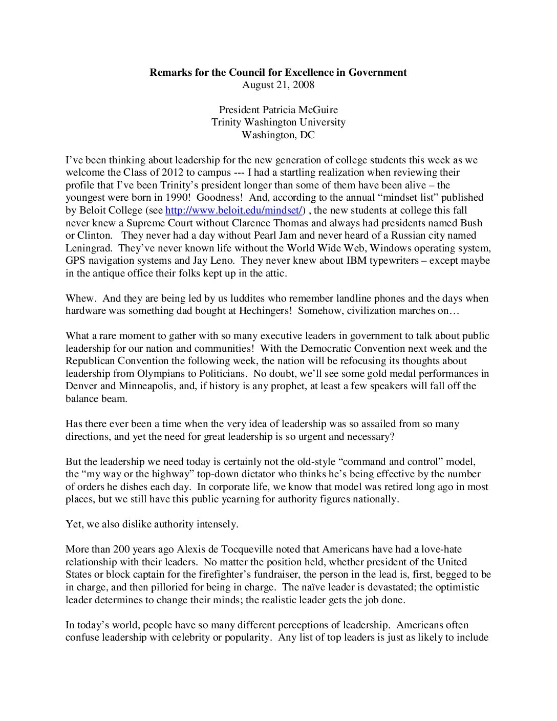 Remarks for the Council for Excellence in Government, 2008