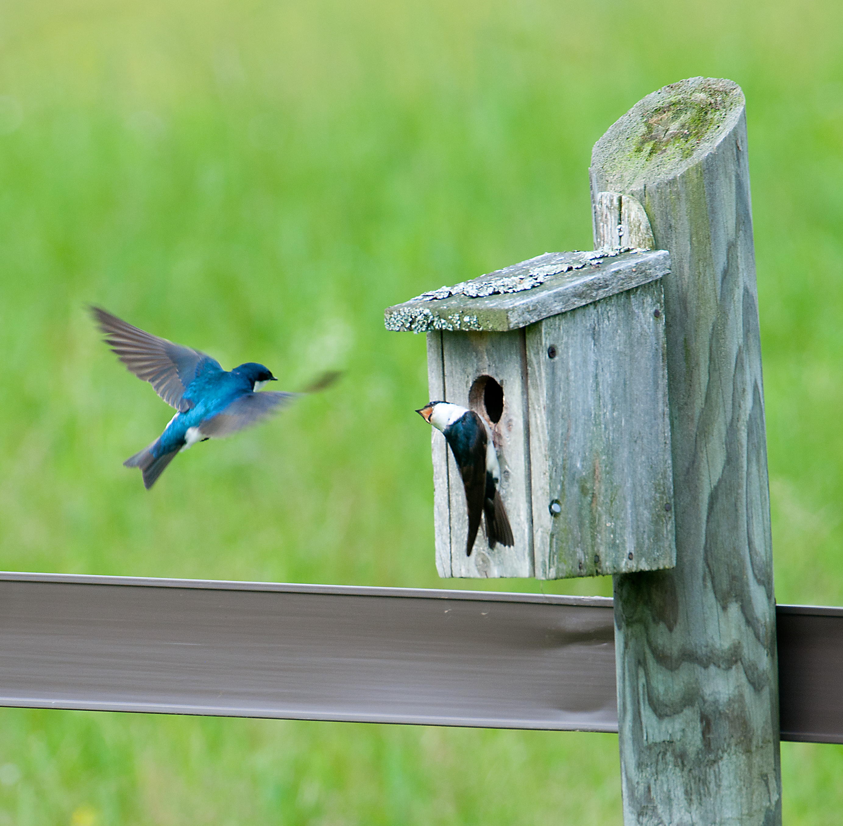 On a meadow near Lake Placid, these tree swallows seemed to be having an argument about who would get first dibs on the birdhouse….