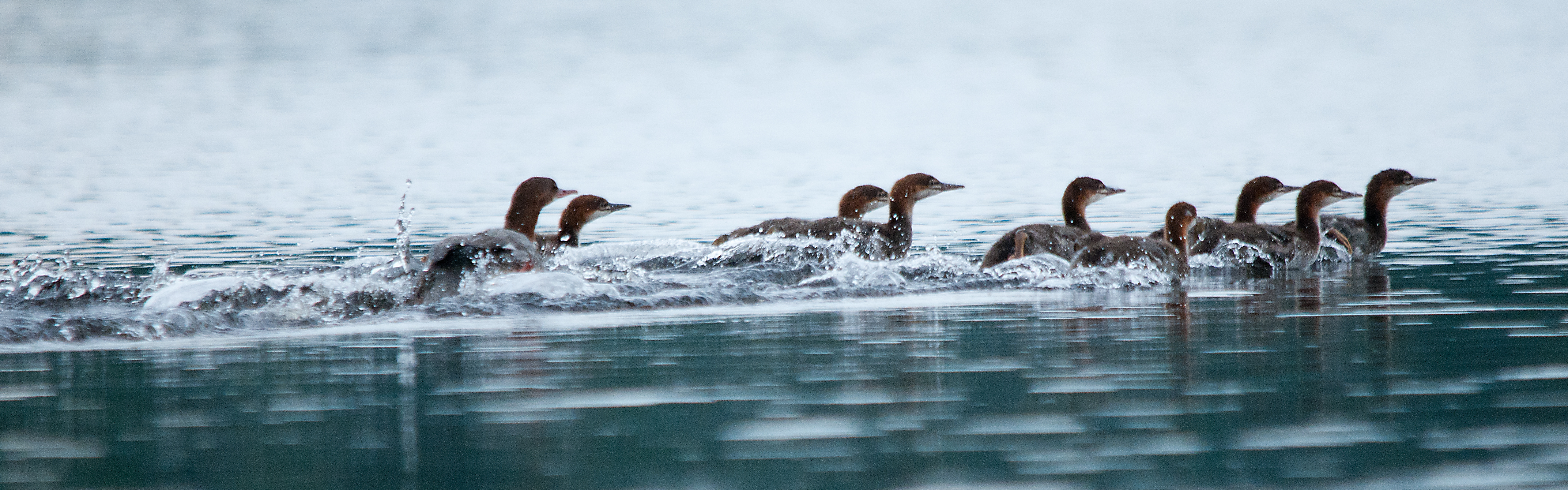 This common merganser and her chicks came around a bend in the lakeside, and when they sensed my presence (I keep a distance, my lens is long, but their senses are longer!…) they did that racing thing that is quite amazing to watch…