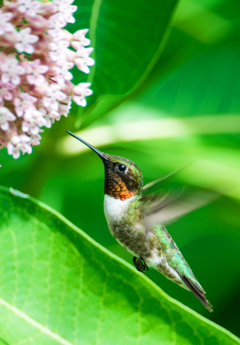 Hummingbirds are the most elusive little creatures! They fly so fast it’s easy to miss them, and when they buzz among the leaves they blend easily into foliage. But now that the milkweed flowers have burst open all over the place, the hummers are out in force! I find these ruby-throated birds and their long beaks, very delicate wings and feathers to be fascinating.