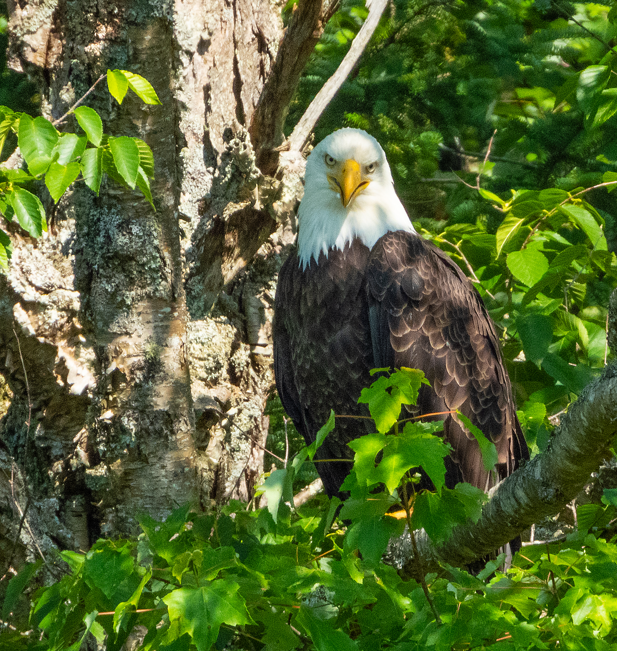 Typical human, I was driving along a back dirt road along Horseshoe Lake — a favorite place to spot cedar waxwings and hummingbirds.  As I rounded a curve approaching a lovely outlet near the lake, I heard a loon calling nearby, and thought it strange since usually the loons are far out on the lake. As I came around the curve and the loon call grew louder, I was startled to see a beautiful big bald eagle perched calmly on a lower branch of a small sapling just across the outlet: