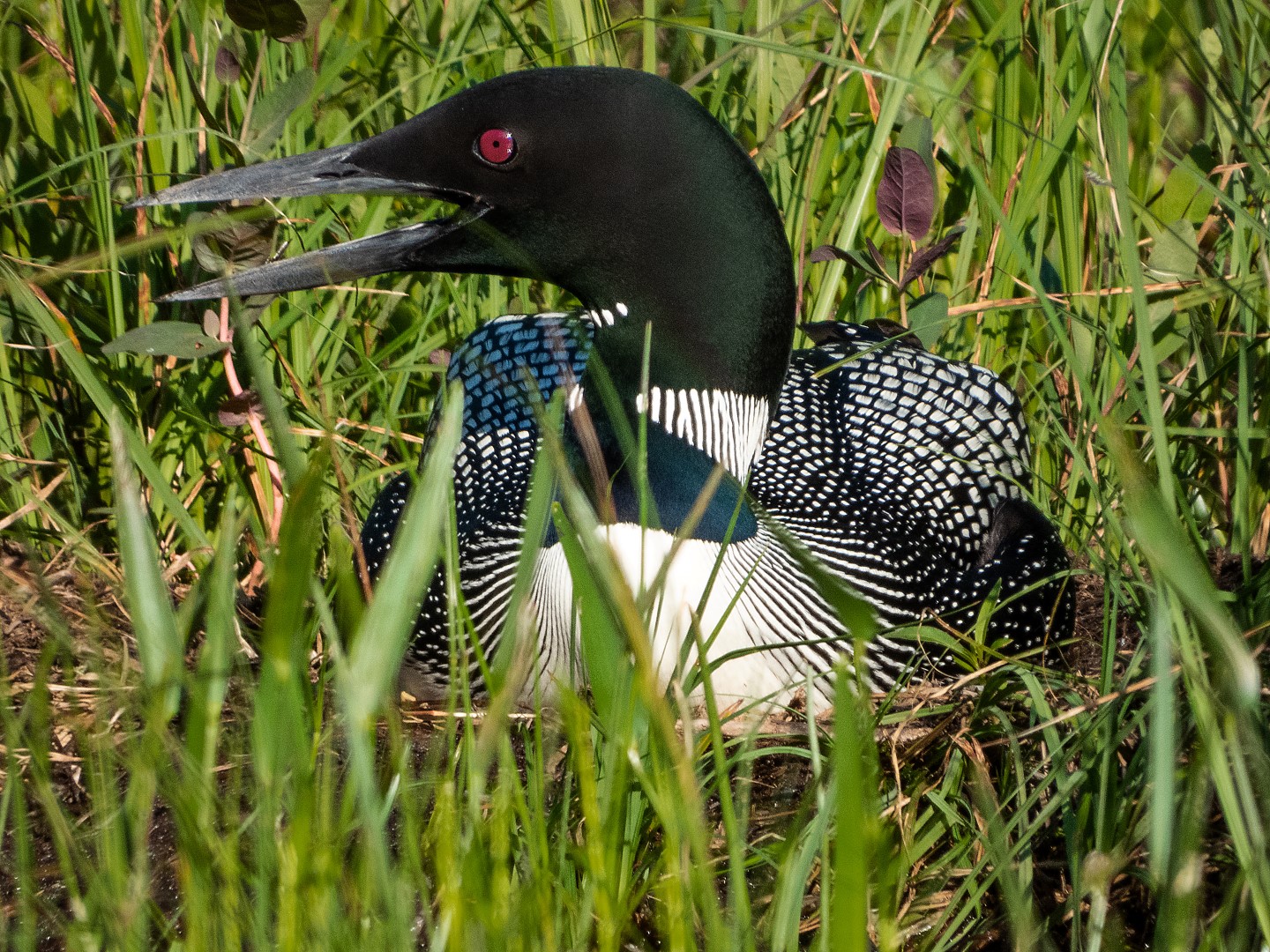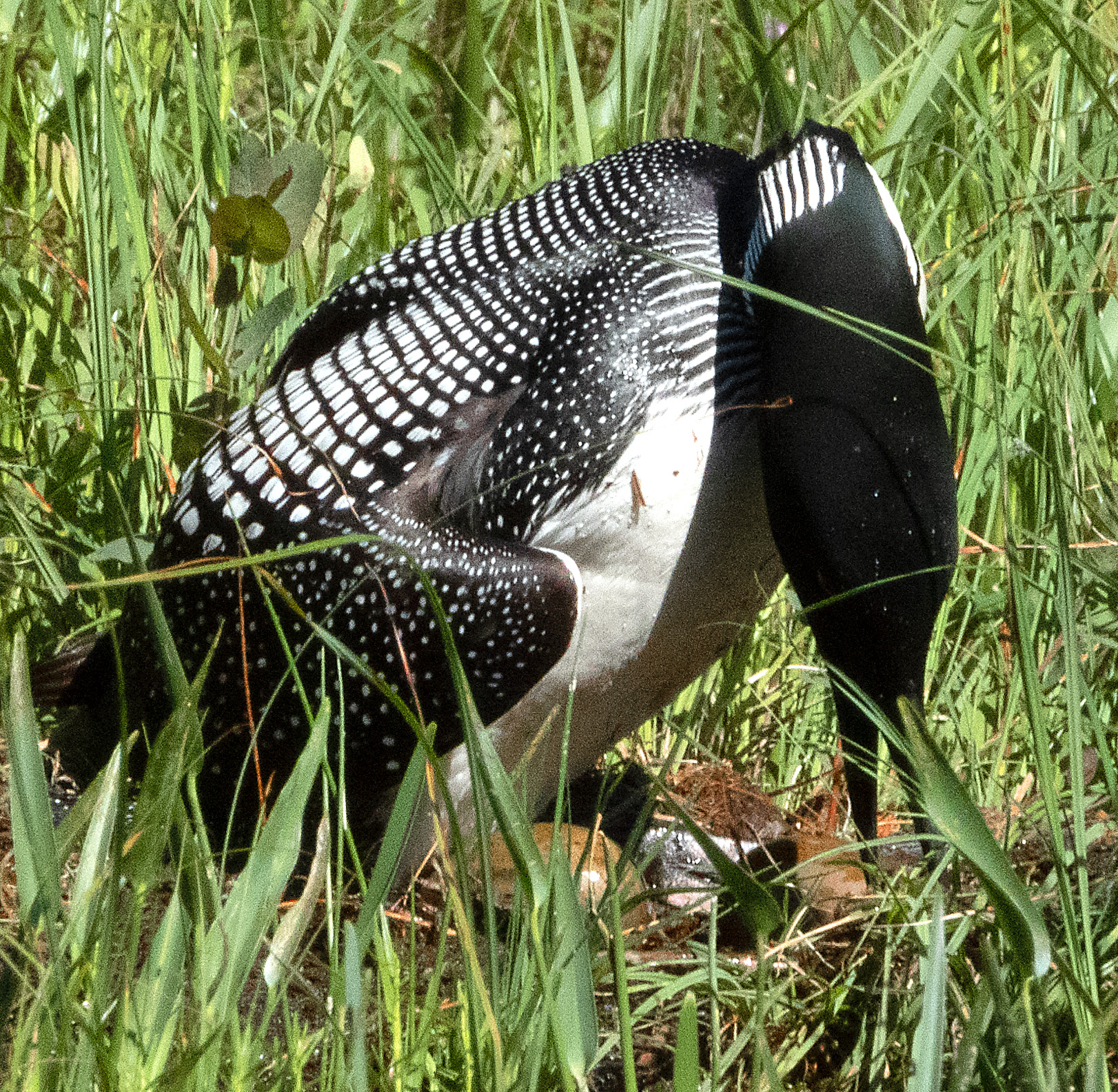 Yep, those are the loon eggs our duck has been protecting. Aren’t they beautiful? And big! And here she is settling down to brood on them to keep them warm awaiting the hatch…