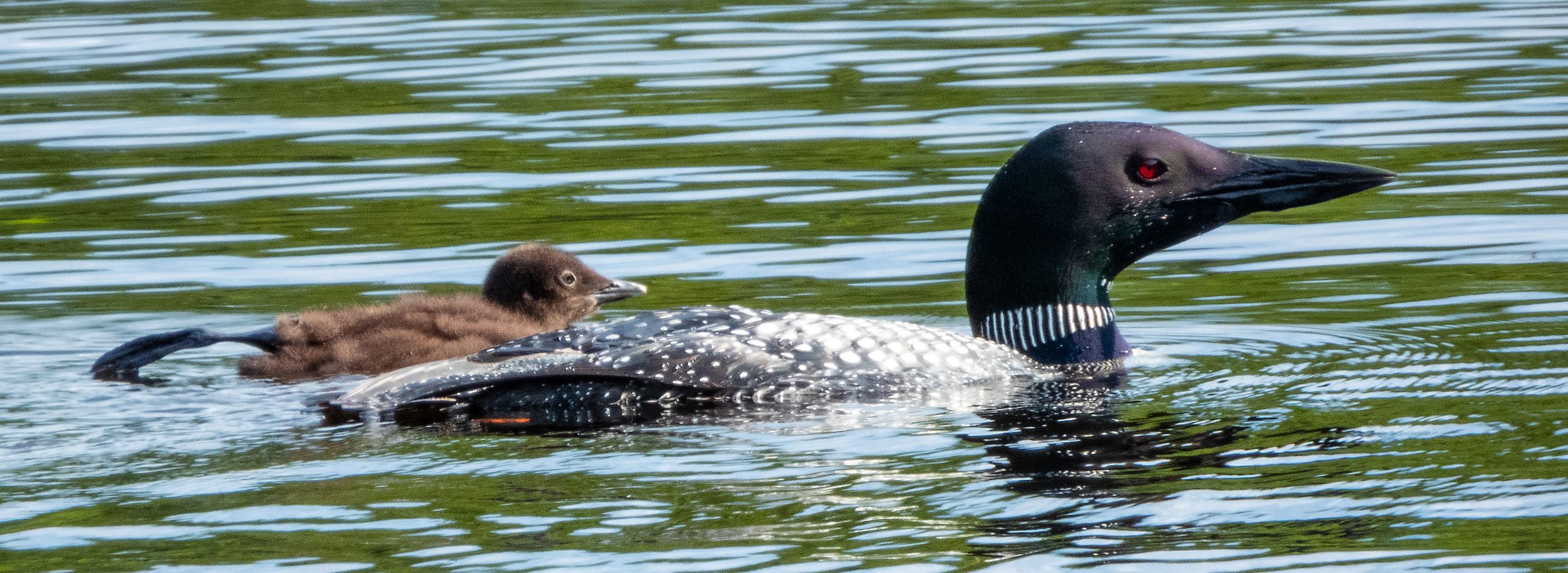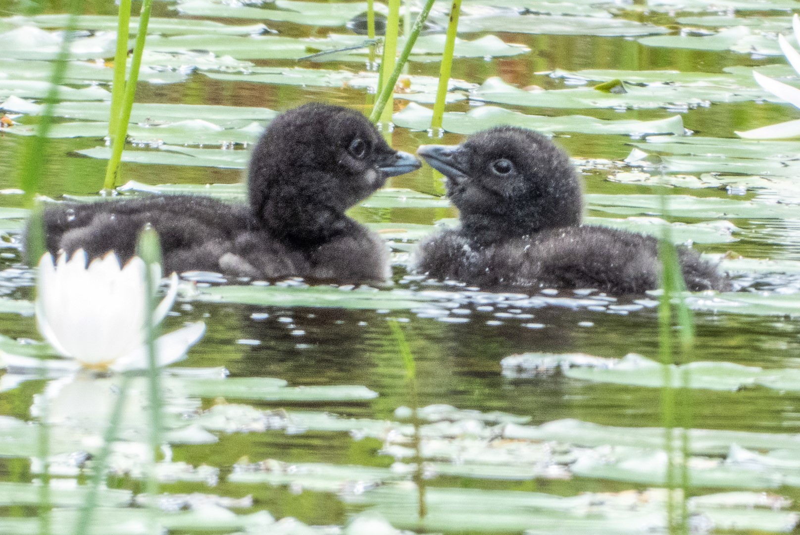 I watched the loon nest for eleven days, from July 3 to the 14th, and lo and behold, on the 11th day the chicks emerged and started swimming immediately! That little guy above is meeting its other parent for the first time, and they went off together into the marsh and then the big lake beyond. Loons take up to 28 days to hatch, so I must have started watching the middle of the cycle.