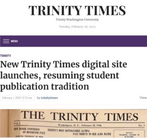 The new Trinity Times digital site has launched, resuming the student publication tradition. The new Trinity Times will offer news in the traditional article format, as well as digital content in the form of video and podcasting, all while engaging the wider audience in social media. The creation of the new multimedia newsroom was made possible through a grant from the Evelyn V. Davis Foundation. Read all about it in the Trinity Times February Edition