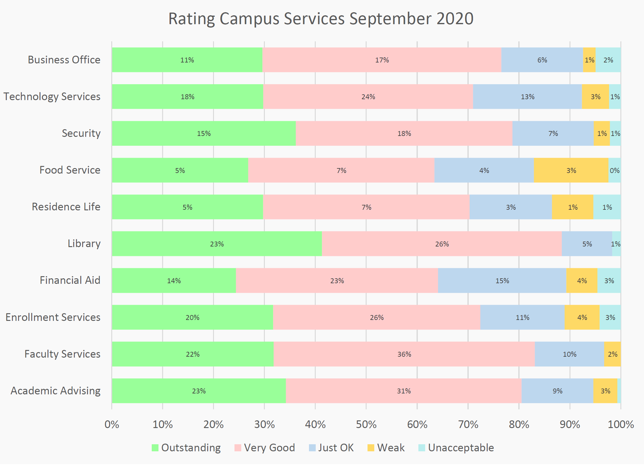 We asked you to rate your experience with campus services during the first month and the answers are above and also we received numerous comments. We are sharing the comments with the managers responsible for the services and we appreciate everyone’s candor. We will be checking back with the campus community about this kind of rating survey every so often so we can collect data across time to measure improvement.