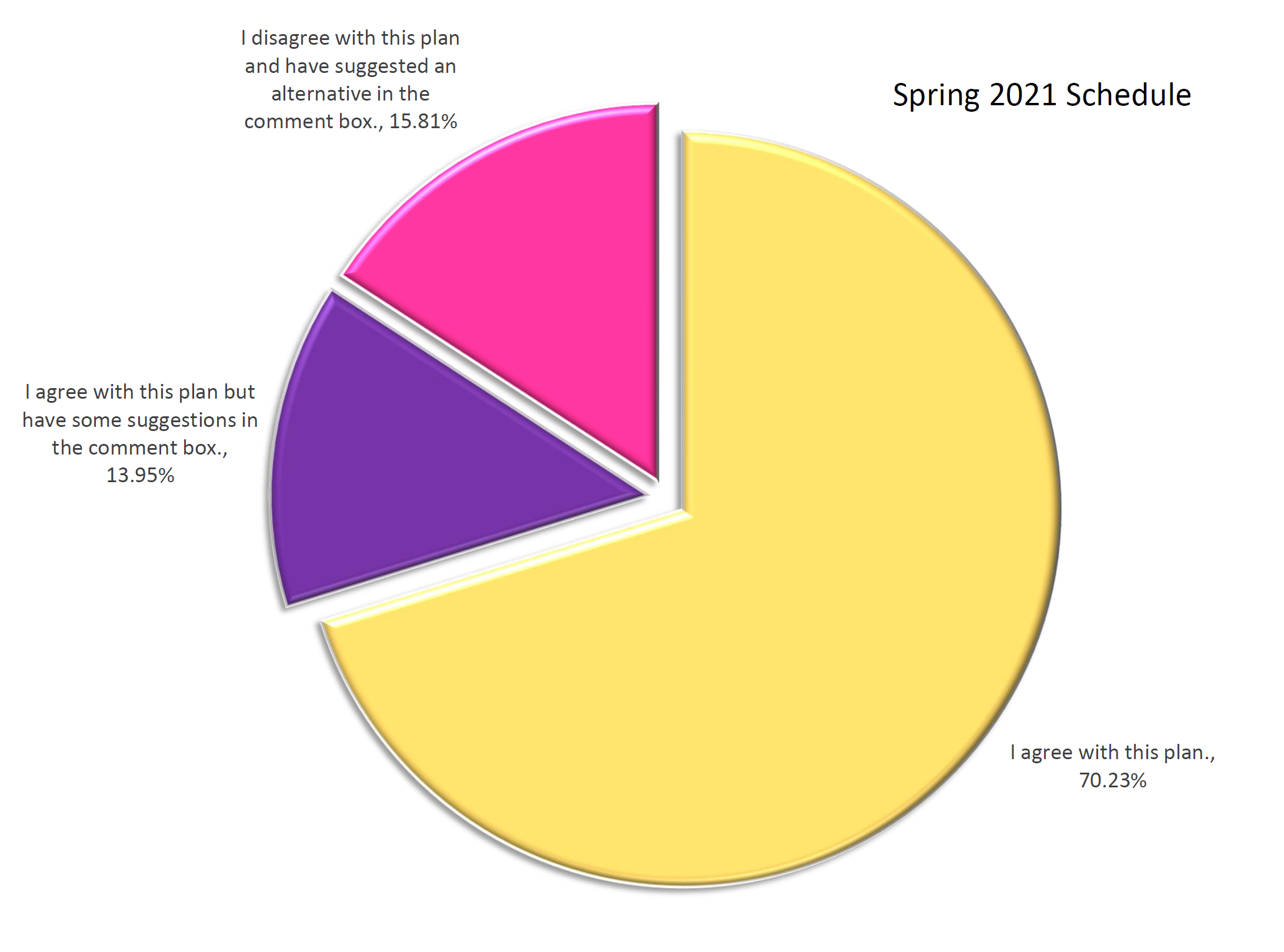 The question read as follows: For the Spring 2021 semester, we are proposing a schedule that moves back the start of CAS daytime and weekly classes from January 11 to January 25, and CAS classes will continue to be a mix of face-to-face, hybrid and online. To make up those two weeks so that we can still end on time, we will eliminate spring break (March 8-13 on the CAS calendar). Winter Term classes will extend over the first three weeks of January in online format only. Other classes for graduate and professional schools will start at the originally scheduled times and will continue to be online except those NHP labs and classes that need to meet face-to-face.