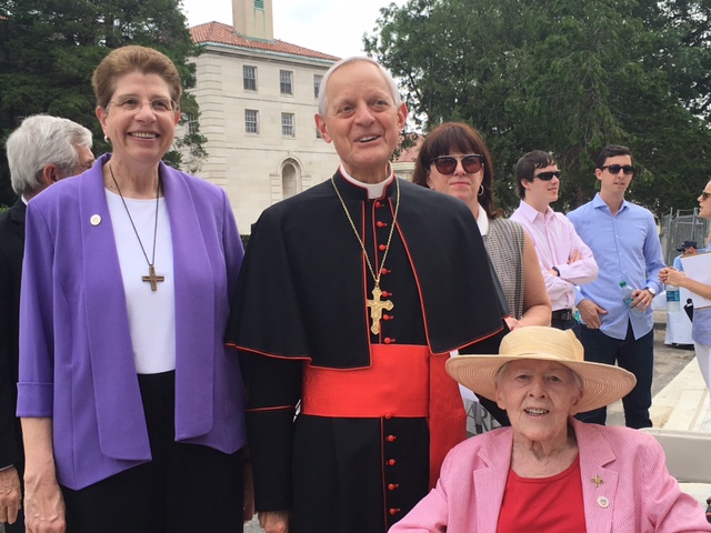 Sister Margaret eagerly joined Board Chair Sr. Patricia O’Brien, SND (left) and Cardinal Donald Wuerl (center) for the dedication of the Payden Center in 2016, her last visit to Trinity. She now resides at the Mount Notre Dame Health Center in Cincinnati, where alumnae will gather today to celebrate with her as she marks this grand occasion.