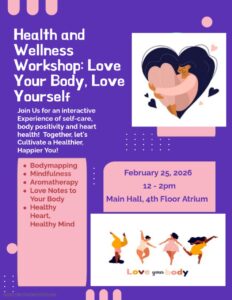 Join the Health and Wellness Center staff for an interactive experience of self-care, body positivity and heart health! Together let’s cultivate a healthier, happier YOU!