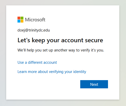 - Select the Next button when presented with a pop-up box from Microsoft stating Let’s keep your account secure.