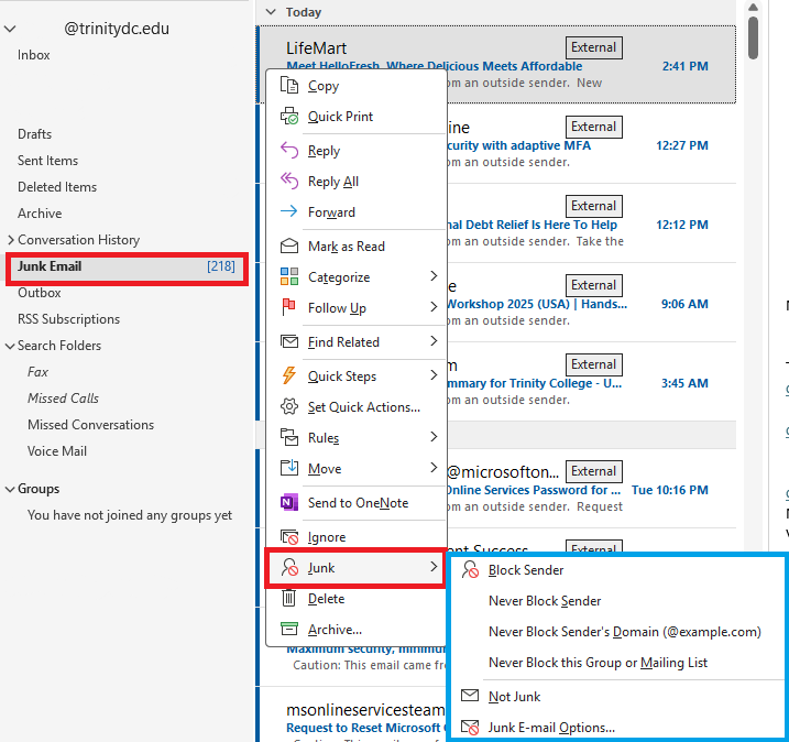 Spam protection is automatically enabled on all Trinity mailboxes. Email flagged as spam will be delivered to a folder named Junk Email. It is possible that a legitimate email may be marked as spam, otherwise known as a false-positive. Follow the instructions below on how to manage your allow and block lists to always-allow or always-block specific email senders.
