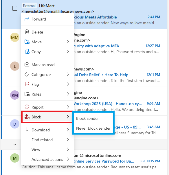 If you utilize Outlook Web Access rather than the Outlook desktop client, allow and block lists operate the same. Right-click on any email, select Block, and then select either Block sender or Never block sender.