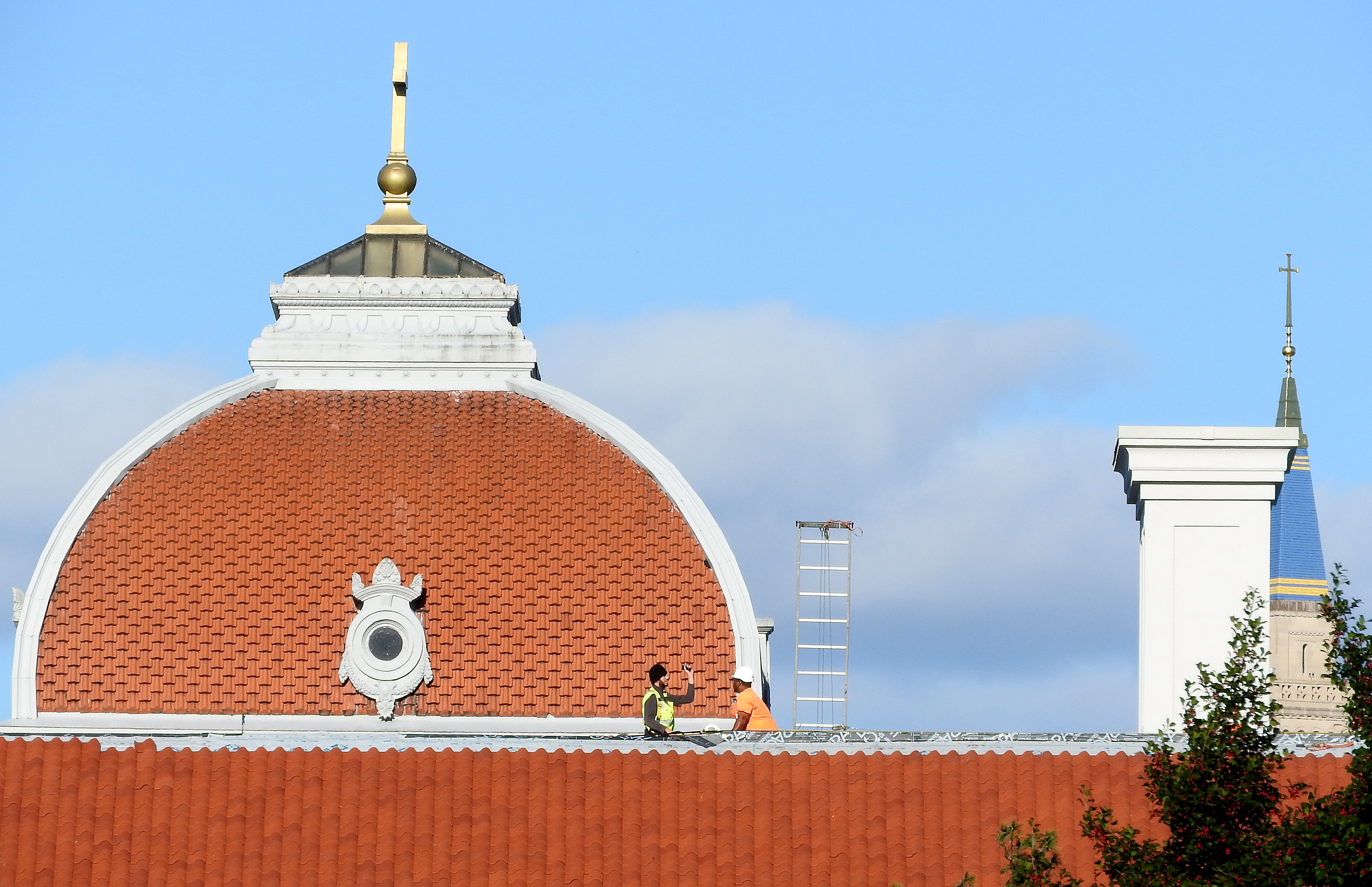 In those photos above the red tiles at the bottom are the new roof, a great match for the 115 year-old tiles of Main Hall’s great dome!