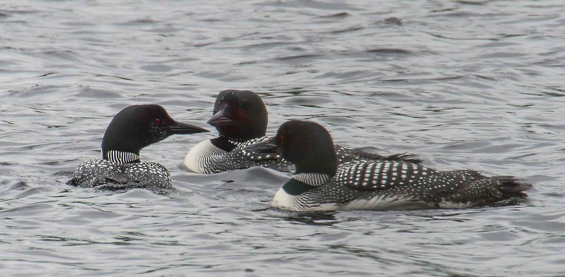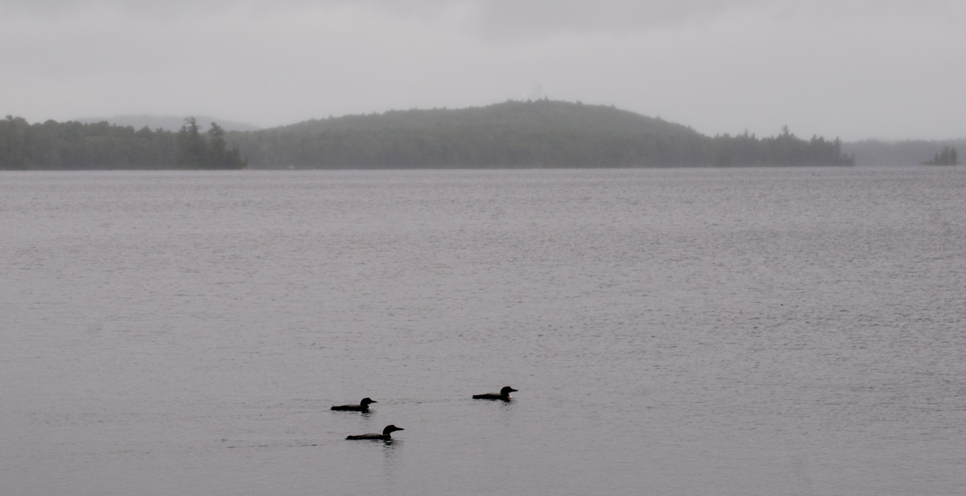Sunday was gray and rainy when I stopped along the shore of Little Tupper Lake, a great example of how smart state policy preserves wilderness in the face of the urge to develop. I saw three loons playing on the water, joyful in the rain, and with a long lens and the shield of brush along the road, I was able to get close enough for a few quick snaps before they held a caucus and decided to swim away.