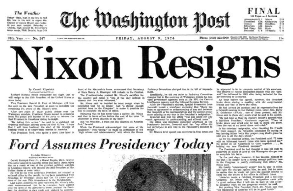 A confluence of many factors forced the resignation of Richard Nixon: a bumbling “third rate burglary” of the Democratic National Committee office in the Watergate apartment complex by agents of Nixon’s campaign for re-election to a second term; a staunch chairman of the Senate Watergate Committee, the formidable Senator Sam Ervin; courageous testimony of Nixon aides revealing a secret audio taping system in the Oval Office; a Supreme Court that knew its real role in the balance of powers rejecting Nixon’s claim to “executive privilege” for the tapes (U.S. v. Nixon).