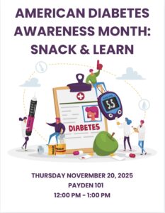In honor of American Diabetes Awareness Month, take a break, grab some snacks, and learn about diabetes care and prevention. This is a great chance to boost your health knowledge, ask questions, and connect with peers in a relaxed setting.