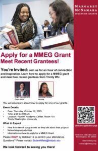 Event Details Date: Thursday, October 16, 2025 Time: 2:00 to 3:00 pm Location: Payden Academic Center, Room 101 Trinity Washington University What to Expect Hear from two of our grantees as they talk about their projects Networking opportunities Information on how to apply for a MMEG Grant.
