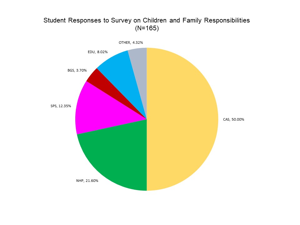 We have conducted a survey of Trinity students to learn more about how many are also caring for children or have other family responsibilities. 165 students participated in the survey, arrayed by school as the graphic above illustrates. [For readers not familiar with the acronyms: (CAS) College of Arts & Sciences, (NHP) School of Nursing and Health Professions, (SPS) School of Professional Studies, (EDU) School of Education, (BGS) School of Business and Graduate Studies. Note that CAS is full-time daytime undergraduate women. Also, the units SPS/BGS/EDU are clustered now into the coed School of Professional and Graduate Studies and these programs serve students who are largely working professionals attending part-time.]