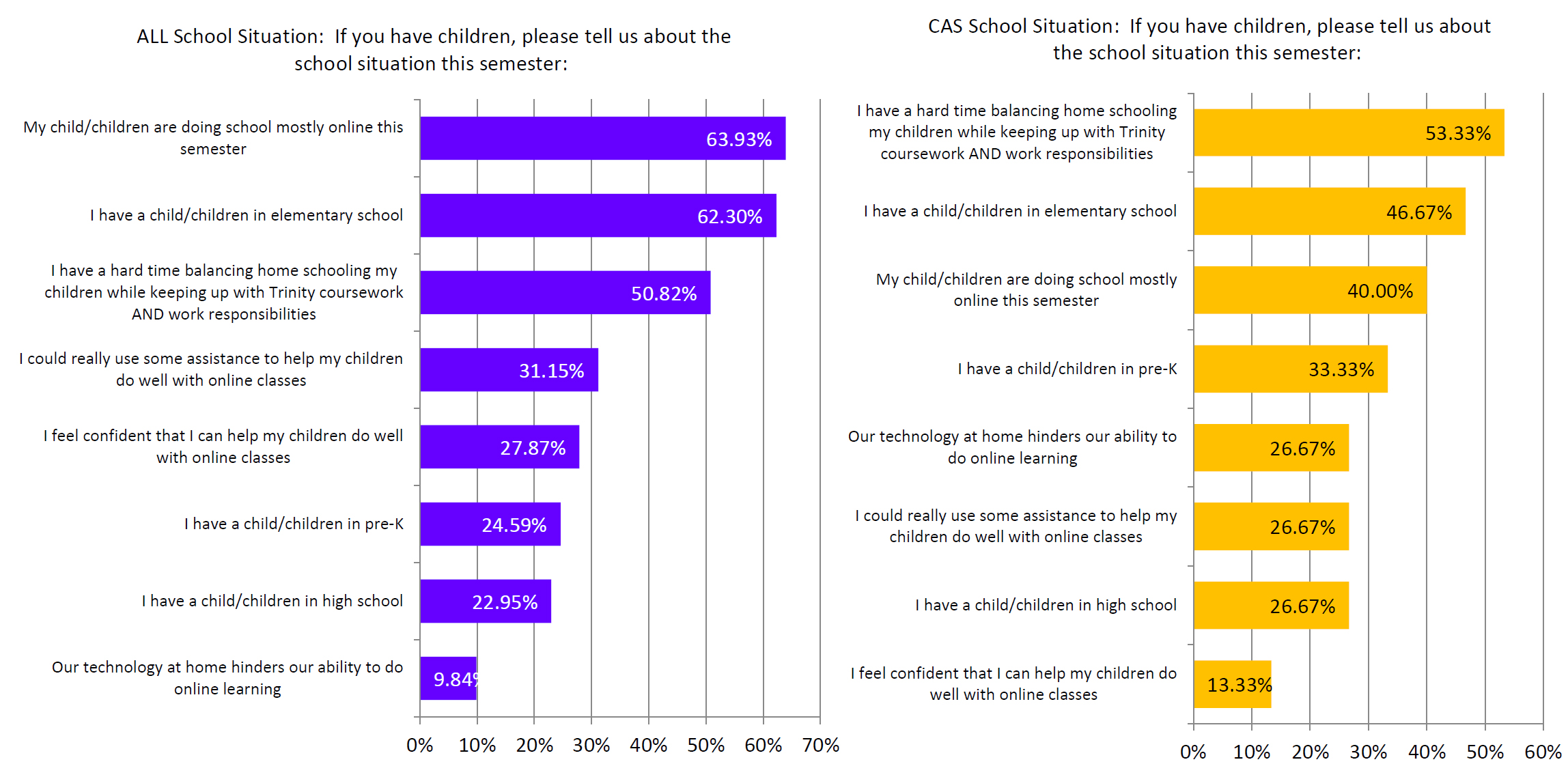 - CAS students respondents report greater concern about the state of technology at home (27% of CAS respondents have a concern about this versus 10% of all respondents) and they also express greater concern about their ability to help their children with online classes.