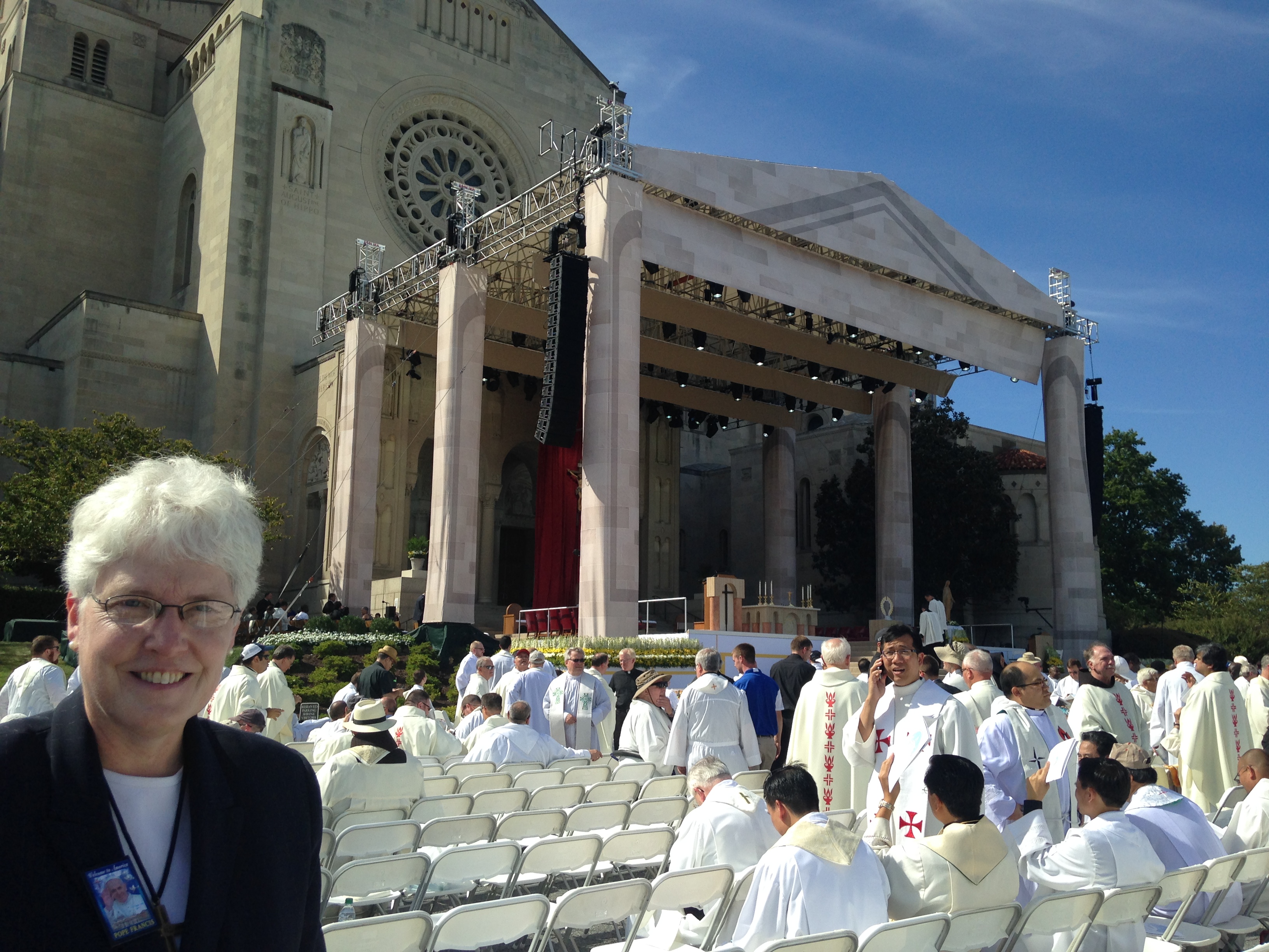 Sr. Mary Johnson, SND, Professor of Sociology and Religious Studies (above, left) at the Basilica of the National Shrine before the Pope’s Mass Canonizing Junipero Serra begins.