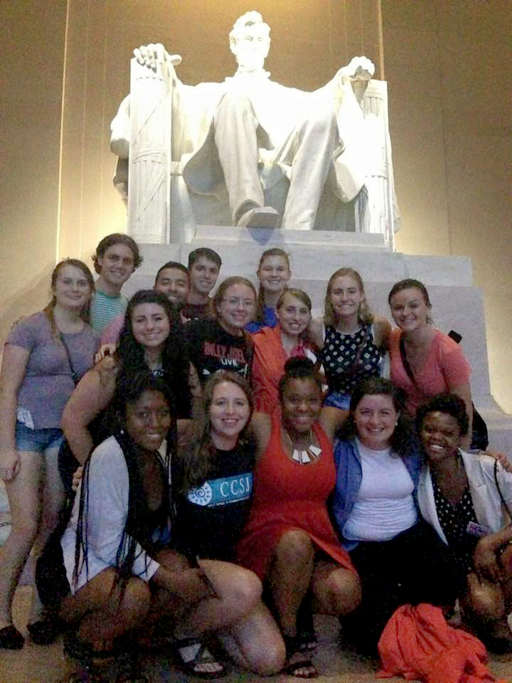 I am pleased to share the essay of Joseline Araujo ’17 (with summer internship friends, top row center) who spent the summer with NETWORK, a remarkable social justice advocacy organization founded by a group of religious women 40 years ago at Trinity.  NETWORK is famous for the “Nuns on the Bus” movement bringing witness and advocacy to communities across the nation.   In 2014 Trinity bestowed an honorary degree on NETWORK President Sr. Simone Campbell and she gave the January 2014 commencement address.  The Sisters of Notre Dame have been active with NETWORK, and Joseline was able to secure this great internship through her class with Sr. Mary Johnson.  Read on:
